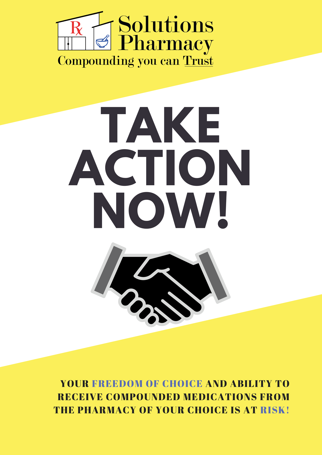 Sample message: “I have been using compounded medications for years when regular manufactured medications didn’t help me, I found a compounded medication that did. Please co-sponsor the HR 2871 and support this bill, many people including myself would be devastated if our choice is taken away as to where we can or cannot get our medications from.”